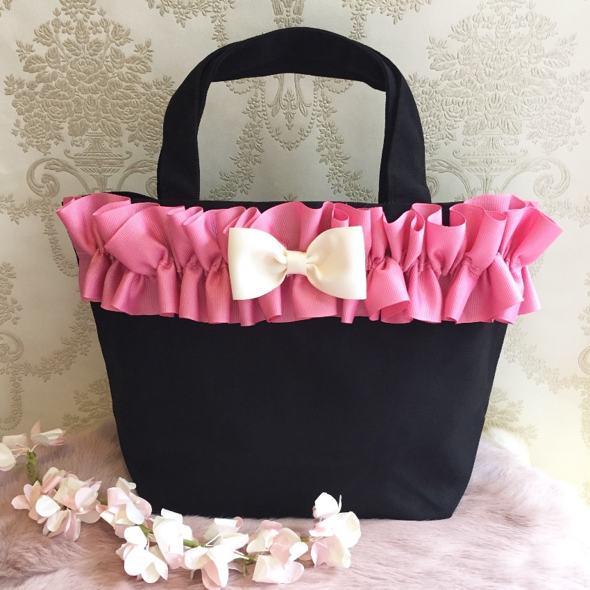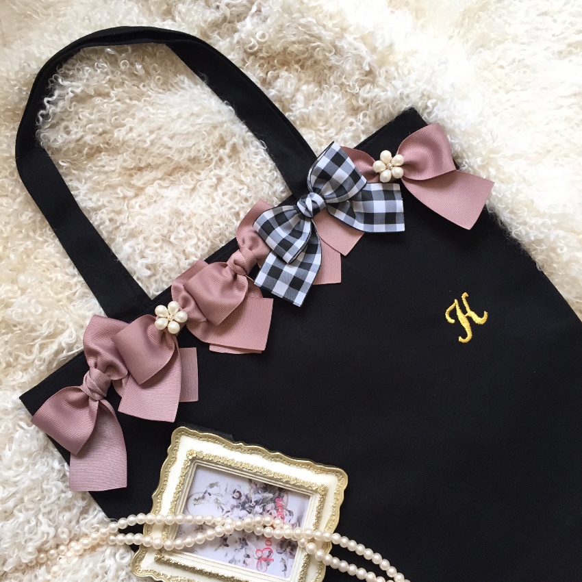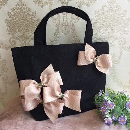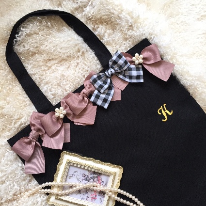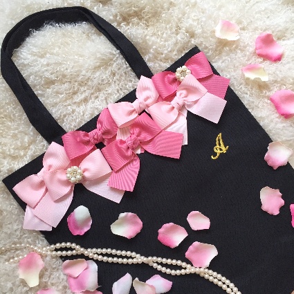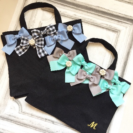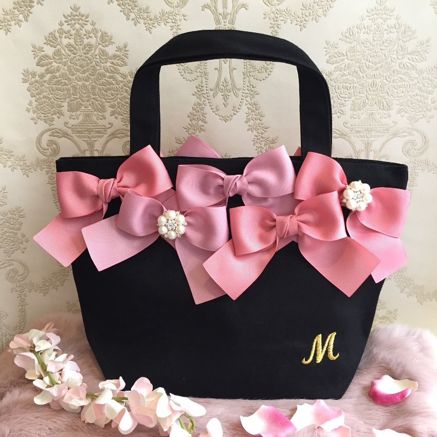 お好きなリボン、ビジューを選んで頂きリボンバッグをお作りいたします。リボンは常時20種類以上、ビジューは10種類以上ご用意しております。